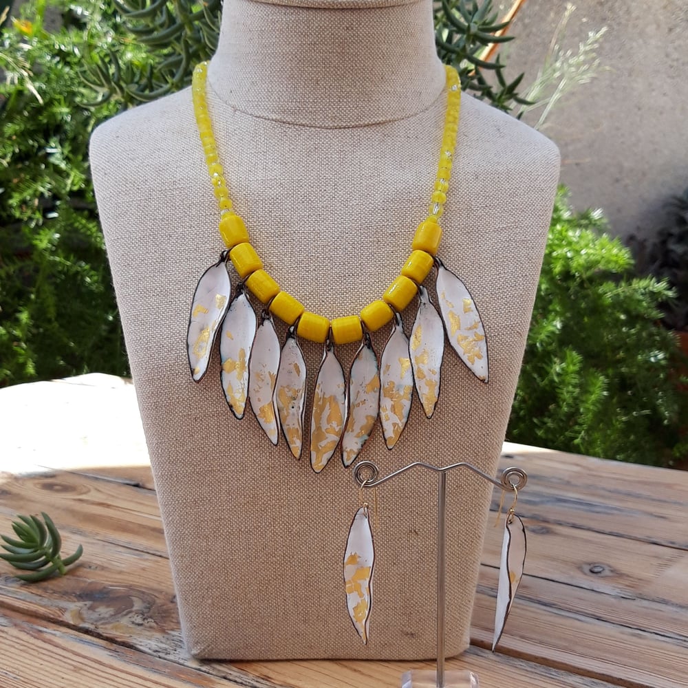 Conjunt fet a mà per l'autora. Pètals tallats i treballats manualment un a un, esmaltats (650º) en blanc opac i làmina d'or autèntic. Està acompanyat amb boles de vidre groc. Metall de llautó envellit i banyat per preservar el color. Les arrecades porten el ganxo de plata de llei banyat en or.